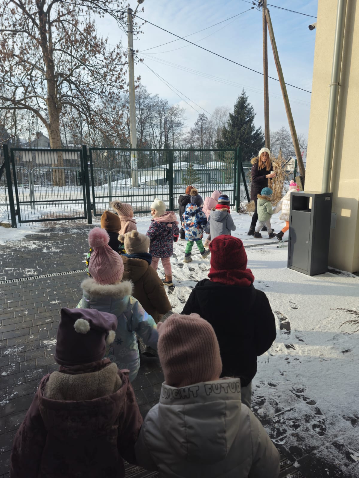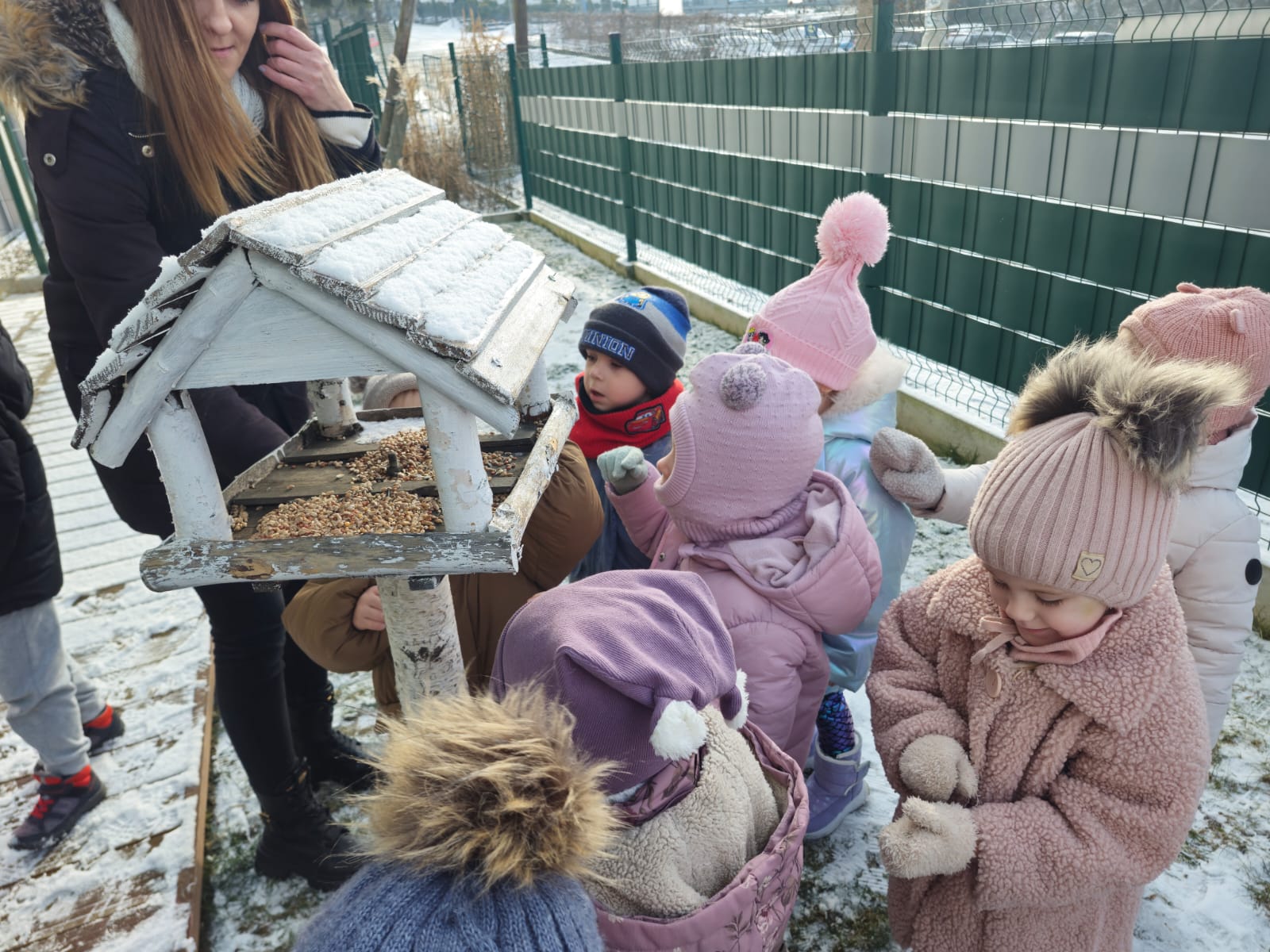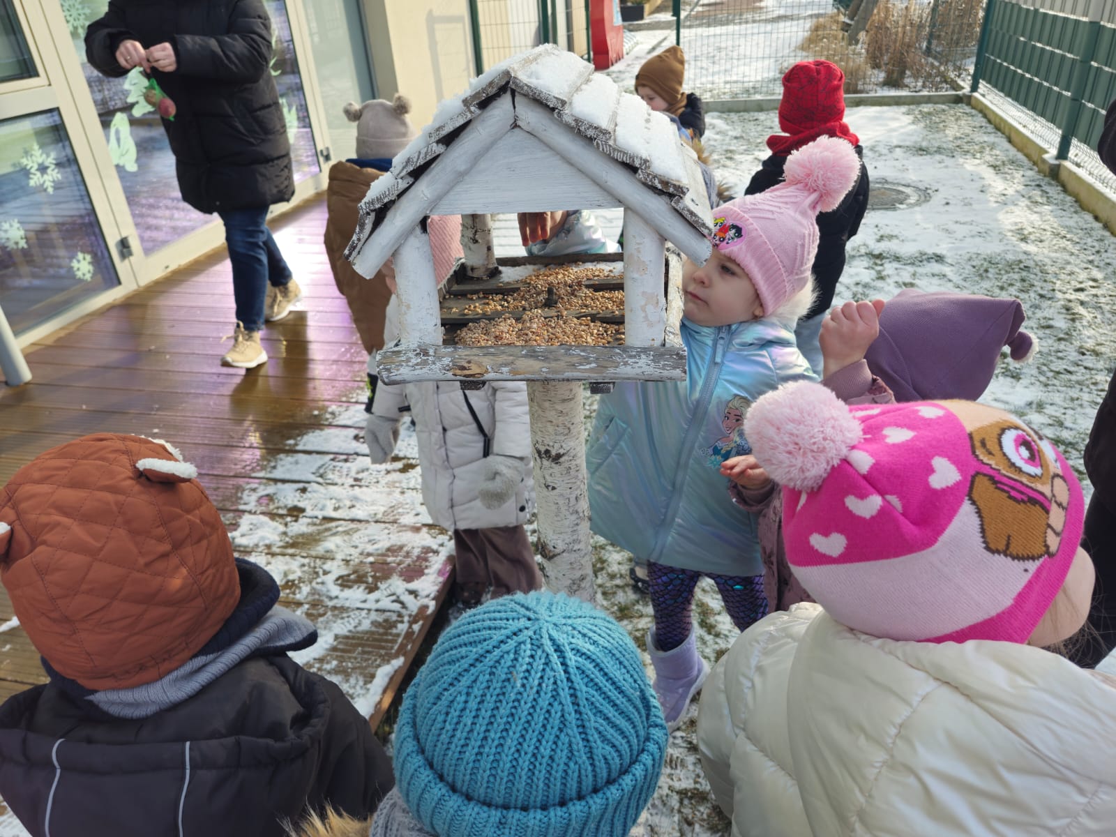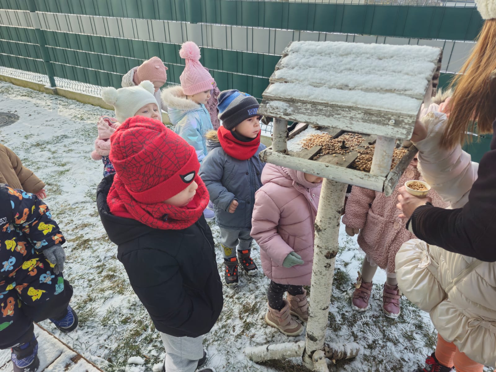 Zima to trudny czas dla ptaków, dlatego jak co roku nasze przedszkolaki z wielkim zaangażowaniem pamiętają o skrzydlatych przyjaciołach. „Jeżyki” dbają o to, aby karmniki w przedszkolnym ogrodzie były zawsze pełne ziarenek. Ogromną radość sprawia im wyjście do ogrodu, kiedy mogą wrzucić do karmnika kilka ziarenek do karmnika lub zawiesić kulki tłuszczowe dla ptaków.